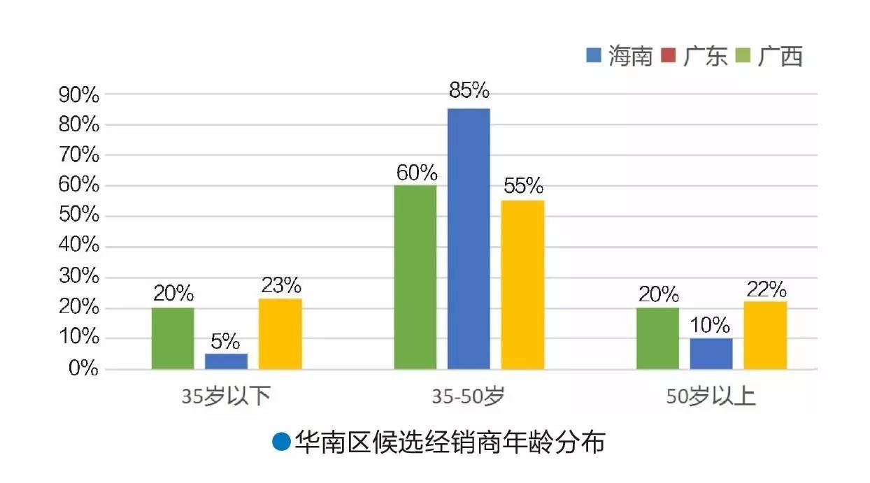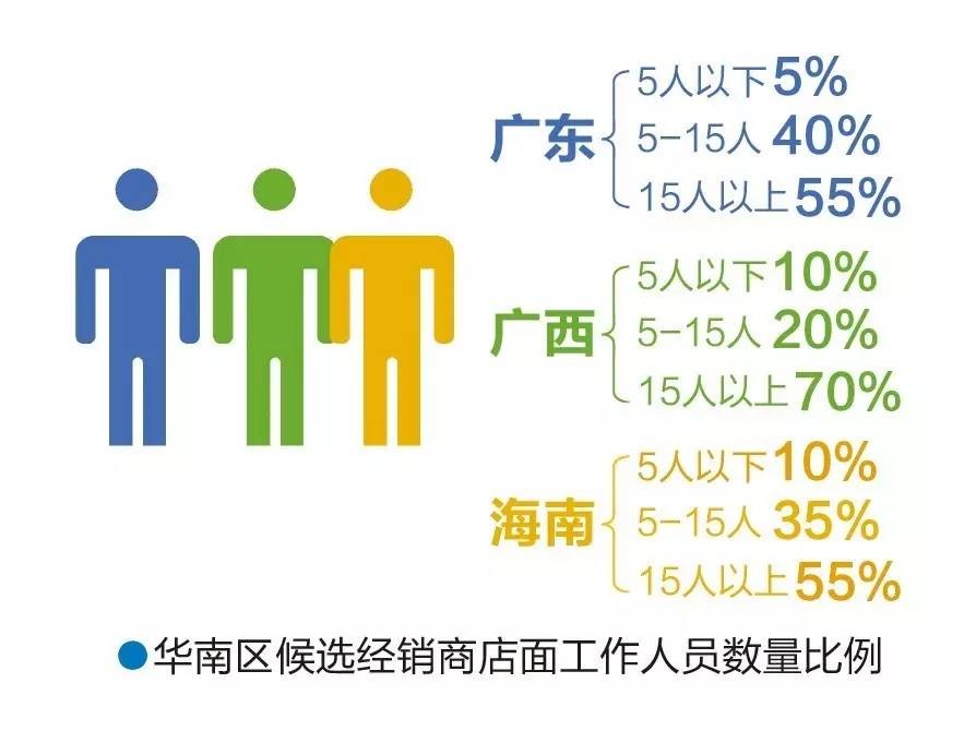 从表中可以看到,华南区300个候选经销商中经营规模存在较大的差异。候选名单中,广东省和海南省员工为15人以上(规模较大)的店占一半以上,广西省则占70%,5人以下的店占比均较低,说明候选名单中的经销商中规模普遍较大,实力较强。