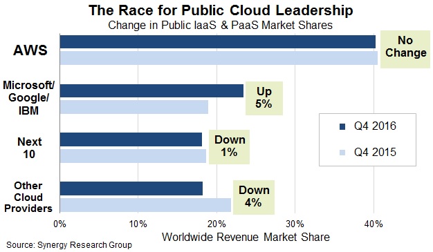 根据Synergy Research Group 第四季度的数据,亚马逊AWS继续保持公共云服务市场的主宰地位,份额超过40%。