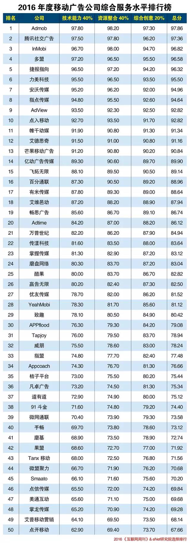 2016年广告公司排行榜 据胜三管理咨询的调查资料显示:目前中国拥有 37,144 家本土代理商和 277 家跨国广告代理商,总收入分别为 73,632 百万人民币和 24,602 百万人民币。 然而,作为广告人除了对4A公司名单以及重点竞争对手有些许了解以外,对全国范围内各广告公司的综合实力可谓知之甚少。 近日,国内权威杂志《互联网周刊》就根据资源整合度、创新能力、广告技术、广告主口碑和团队能力等对中国网络广告公司和移动广告公司进行综合评估,并最终评选出整合发展力前50名的广告公司。 更多阅读:百度指数:2019年3月汽车行业排行榜TIOBE :2016年3月编程语言排行榜2016直销银行排行榜CodeForge:2014年11月“我最喜爱的编程语言”排行榜TIOBE:2012年8月编程语言排行榜Adbug:2015年Q1中国DSP投放实力排行榜Interbrand:2015年第16届最佳全球品牌排行榜European Brand Institute:2016年全球最具品牌价值企业排行榜Top100Forbes:2016年度全球最具价值品牌排行榜2015金牌分析师排行榜2015年全球研发支出排行榜《财富》中文:2015年中国最具影响力商界领袖排行榜The Holmes Report:2016年全球公关公司排行榜Top 250截至2015年11月11日18:00 天猫双十一TOP商家排行榜The Holmes Report:2013年全球公关公司排行榜Top 250