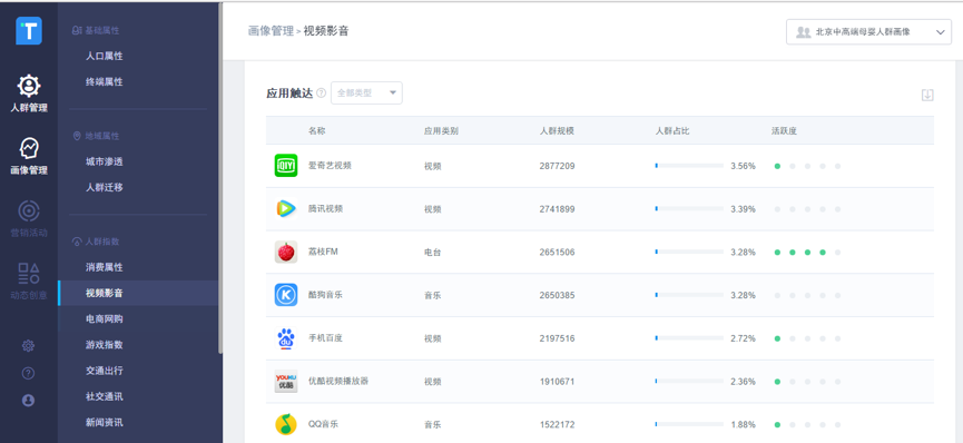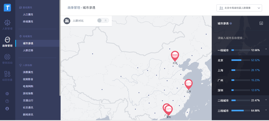 对受众的洞察是一个多元而立体化的过程,有多种角度、多种方案,营销云从TalkingData擅长的领域出发帮助广告主去分析自己的受众,除去一些基础的人口属性、终端属性外,城市渗透、人群迁移、用户指数等一系列维度,都充分显示出移动互联网数据的特点。