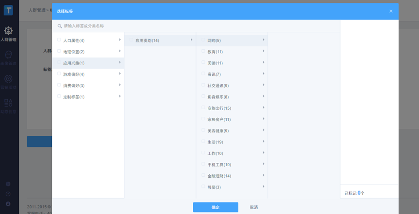 更多的时候,营销是面向那些还未与品牌有过互动或者还不是品牌用户的群体。这时候我们仅有对品牌受众的一个定位和一些简单的描述,要在全互联网的海量人群中通过这些描述找到目标个体受众其难度可想而知。而TalkingData作为国内领先的第三方数据服务平台,对所覆盖的所有移动设备借助科学有效的手段为其打上了标签,目前TalkingData标签库已包含6大标签体系,800+的细分维度,包括人口统计学,城市,设备属性,应用兴趣,消费偏好等等,帮助广告主更有效的构建受众。