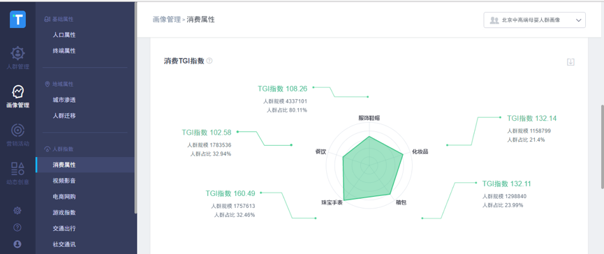 包括了消费指数,视频指数,网购指数,游戏指数,出行指数,社交指数,资讯指数,教育指数,健康指数,金融指数,生活指数; 共11大类,帮助广告主全面了解受众在移动互联网上的行为特征。所有指数同时包含其与全移动互联网人群对比的TGI指数,从而知道受众哪方面特征更加明显。更重要的是,指数部分Talkingdata营销云会给出此受众在这类特征中关联度最高的移动媒体列表,及相关覆盖度、活跃度,从而可以作为媒体选择的强有力依据。