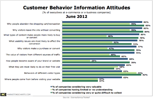 根据Econsultancy和Tealeaf 2012年6月联合发布的调研,多数电子商务企业的高管表示对与用户丢弃购物车和交易了解甚少。几乎所有的受访者表示了解这些信息非常(83%)或相当(17%)有价值,尽管85%的企业在收集信息方面存在困难。另外在了解哪些内容更可能促进用户转化方面,超过3/4的人表示这个信息非常难收集。