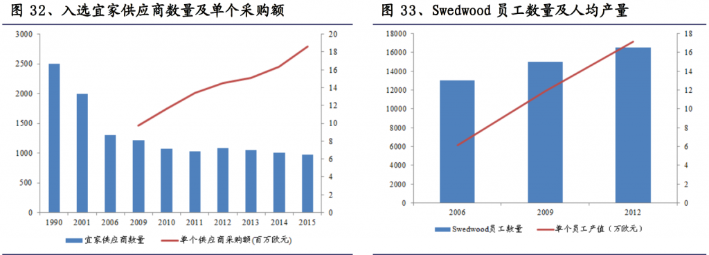 为了保持产品的零售终端的价格优势,宜家在销售规模持续增长的背景下,一方面不断减少入围供应商的数量,提高单个供应商的供货能力和规模经济水平;入选的供应商通常能够得到大订单,这种由世界各地大批量集体采购方式获取较低的价格。1990-2015年,入选宜家供应商数量由2500个减少到978个,数量减少超过60%;同时,宜家供应商平均采购额也迅速上升,由2009年的900万欧元上升至1800万欧元,平均采购额翻番。