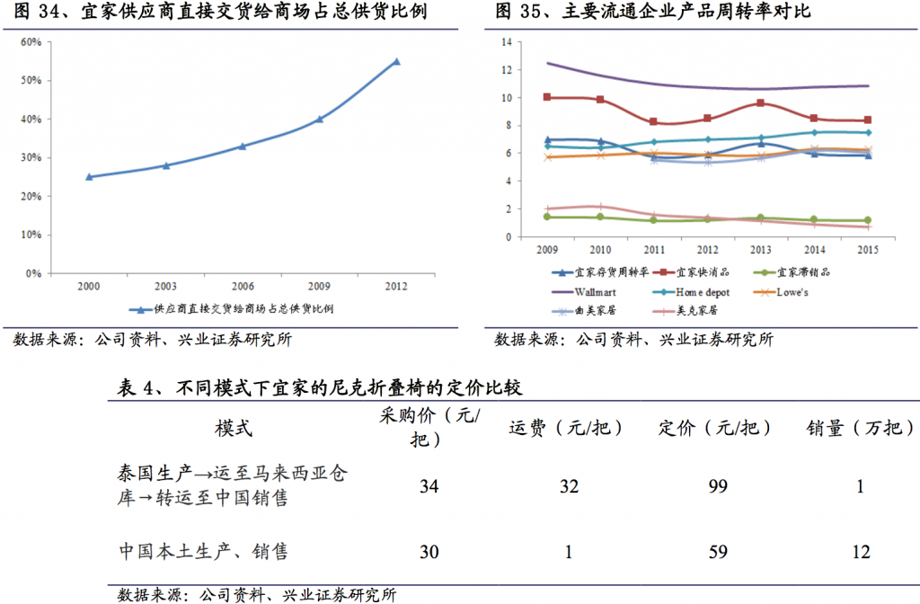 公司大规模全球采购模式对于上游供应商具有较强的议价能力。宜家在全球23个国家和地区有27个贸易办事处负责宜家全球的 OEM运作,每年在55个国家和地区有超过2000个供应商会为此而展开激烈竞争,宜家在选择供应商的标准包括劳动力价格低廉等。宜家90年代将产地更多的转移到成本更低的亚洲;2000-2015年,亚洲采购份额由 22%上升至35%,其中来自中国的份额由10%上升至25%。宜家在全球进行大规模的采购,全球采购的目的之一是降低成本并保持产品的低价格。 宜家的供应商提供的产品针对宜家全球而并不是某个特定的区域,也就是说,宜家要求供应商提供的是具有国际化和标准化的产品,在各国销售的是同一质量和款式的宜家产品,有效提升品类的生产规模。