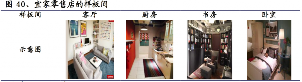 宜家零售店包括开放式的展区、样板间和餐厅三个部分组成;展示区是从 消费者 习惯出发,按照客厅、饭厅、工作室、卧室、厨房、儿童用品和餐厅的顺序排列; 样板间通过将各种产品进行组合,满足消费者不同风格的需求;餐厅在提供休闲场所之余,提升消费者整体的购物体验。