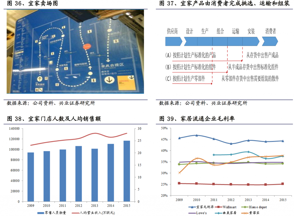 顾客自主购物模式降低人工成本,从而为客户提供“超低价格”。宜家零售店包括开放式的展区、样板间和餐厅三个部分组成,方便消费者自行体验和购物;宜家选择由消费者自己完成商品流通的最终环节——挑选、运输和组装,为宜 家省去了一笔可观的费用。与其他家居门店相比,宜家零售人员主要负责咨询和结款服务,而不是主动进行导购和推销,这些销售手段为公司减少人力成本,零售人员的人均销售额在2009-2015年间提高了60%。