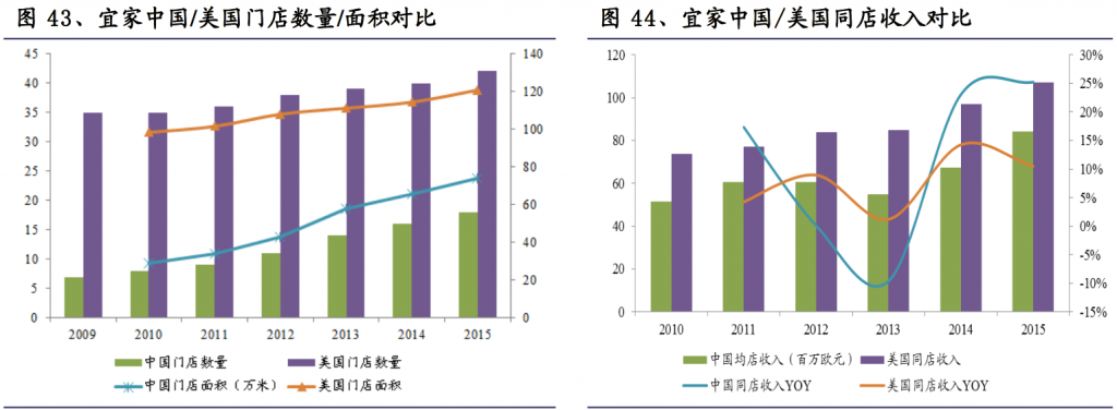 对比宜家中国/美国,两者已经进入不同的发展模式:外延方面,2009年以来宜家美国总门店数和面积增速(2%-3%)大致保持稳定,宜家中国每年1-2 家(增 速约为 15%)的速度扩张。从同店收入角度看,同店增长(10%-15%)已经成为宜家美国的主要增长动力,宜家中国的门店由于同店收入基数小,同店收入水平和增速仍有较大空间。