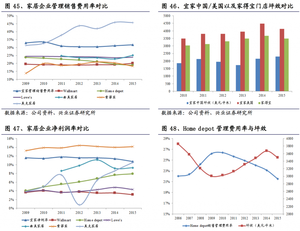 宜家盈利能力相较同类具有显著优势,净利润高于同类的家具零售商Home depot、 Lowe’s,这主要得益于宜家高效的供应链管理及较高的坪效,仅管宜家相应的营销管理费用率也较高(相较 Home depot 门店面积更大且全球管理运营)。随着营销管理效率的提高及新开门店的成熟,前期的营销管理投入逐步带动后期的坪效上升,宜家的销售管理费用率进一步摊薄,Home depot表现出类似的趋势。我们测算宜家中国的坪效相较宜家美国的坪效还具有较大提升空间。