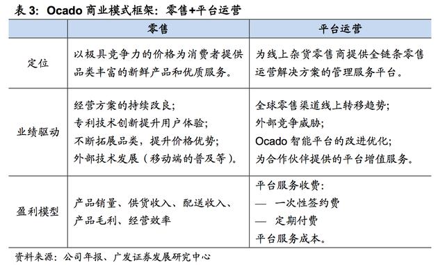 作为一家纯粹的线上零售商,Ocado没有线下的实体商超。公司业务目前由自营零售和平台运营(帮助第三方运营电商业务)两部分组成。其自主研发的冷链物 流技术和智能仓配系统构成公司业务的核心竞争力,基于规模化、自动化经营及专 利技术的革新运用,公司实现了盈利增长、技术创新、效率提升和资本支出的良性 循环。