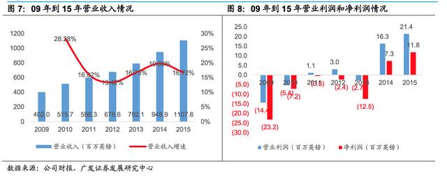 2014年起,公司以Ocado智能平台形式将已成熟的物流技术服务开放给其他零 售商并收取服务费,Morrisons成为公司电商运营平台的第一位合作伙伴。后台供 应链的贡献为公司带来了额外收入使得资产利用率维持较高水平,帮助Ocado实现 了盈利。公司于2014年度实现首年盈利,公司股价也迎来了一波大幅上涨。2015年, 公司实现营业收入11.1亿英镑,在英国零售行业整体低迷的市场环境中依旧保持了16.7%的增长,净利润1180万英镑,同比增速高达62%。