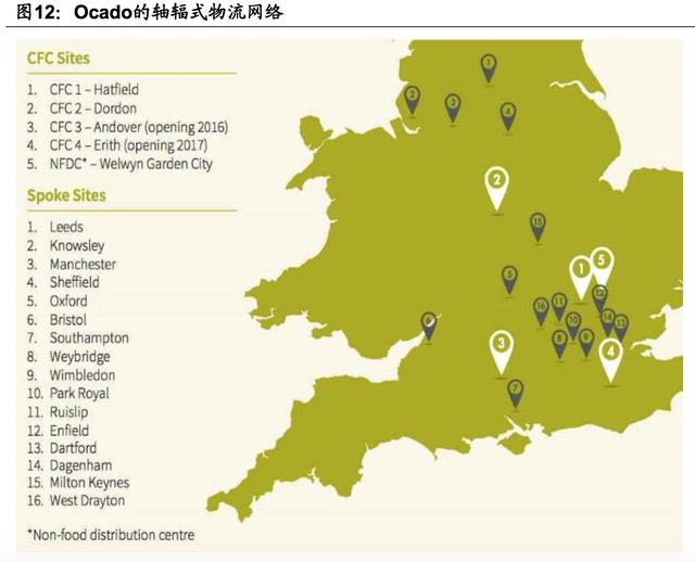 配送方面,Ocado围绕两个配送中心和16个前置仓建立起轴辐式物流网络,所有的订单都在物流中心集中处理出库。