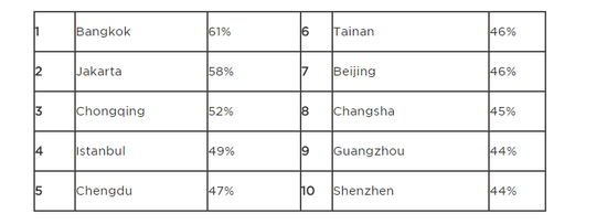 排名前十的城市中,有四座是中国城市。其中,重庆以52%的拥堵指数排名全球第四,也是中国最拥堵的城市;成都以47%排名第七,台南与北京以46%并列第九位。