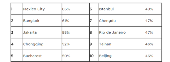 报告覆盖48个国家的390个大城市,依据车主因交通拥堵多花时间的百分比来获得各大城市的交通拥堵指数,然后做出排名。墨西哥城的拥堵指数高达66%,意味着在拥堵时间,车主平均要比正常行驶多花去66%的时间,在晚高峰时段要多花一倍的时间,平均每年堵车时间达227小时。