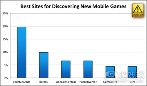 70%受访者声称难以通过游戏内置广告发现自己喜欢的游戏;在针对游戏评论网站和论坛的调查中,20%受访者称Touch Arcade是最有价值的应用发现来源,另外Kotaku、Android Central和Pocket Gamer也同样是支持率较高的网站。Android Central在Android游戏玩家中的影响力与Touch Arcade在所有受访者中的声誉不相上下。