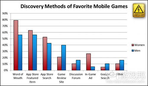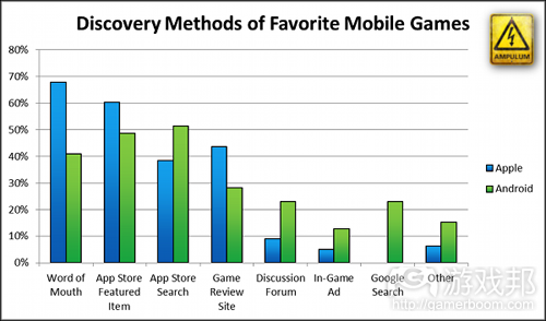 独立开发商Ampulum最近调查结果发现,好友口头传播、应用商店搜索及推荐功能是最有影响力的应用曝光渠道,而游戏内置广告位居游戏评论、论坛和谷歌搜索之后,成为最无效的应用曝光途径(注:该调查样本是127名来自社交网站、游戏论坛和行业邮件列表的活跃手机游戏玩家,调查时间是6月份中的三个星期)。