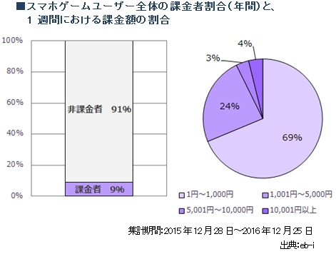 只有9的用户曾在手游中付费,69%的付费用户氪金额不超过1000日元