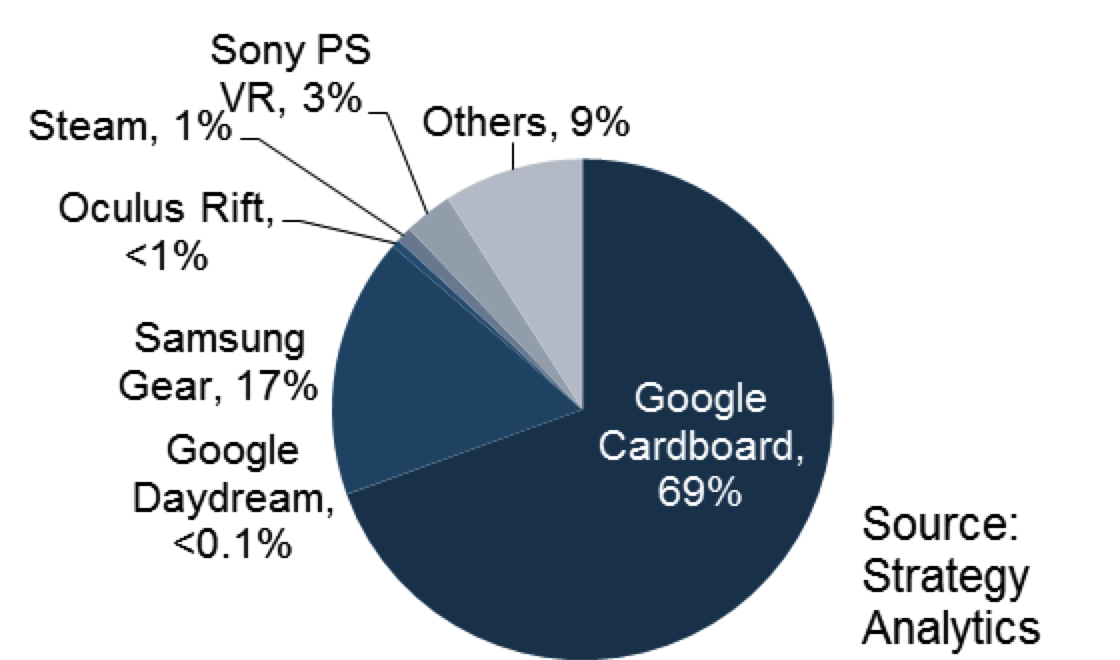 “Strategy Analytics的数据显示,谷歌凭借其超低价Cardboard VR平台在出货量和用户量上保持领先,其用户量已经吸引营销人员和品牌使用VR作为促销工具,然而它却仅占收益份额的12%。更高配的智能手机VR平台三星Gear VR凭借35%的收益份额称冠。索尼PS VR的成功发布使得该平台在收益方面排名第二。索尼和三星在2016年攫取了VR硬件收益的一半以上。”
