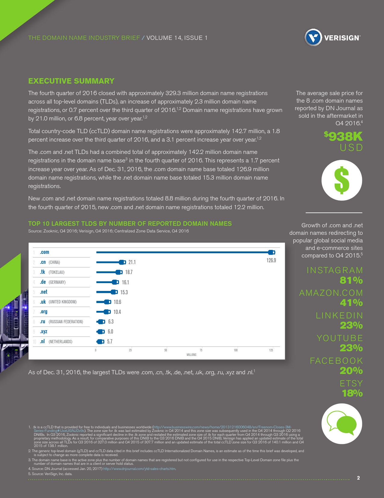 2016年第四季度互联网新增了约230万个域名,截至2016年12月31日1,2,全球顶级域名(Top-Level Domains, TLD)的注册总数达到近3.293亿个。同日发布的在线版《域名行业简报》中亦有此相关数据。