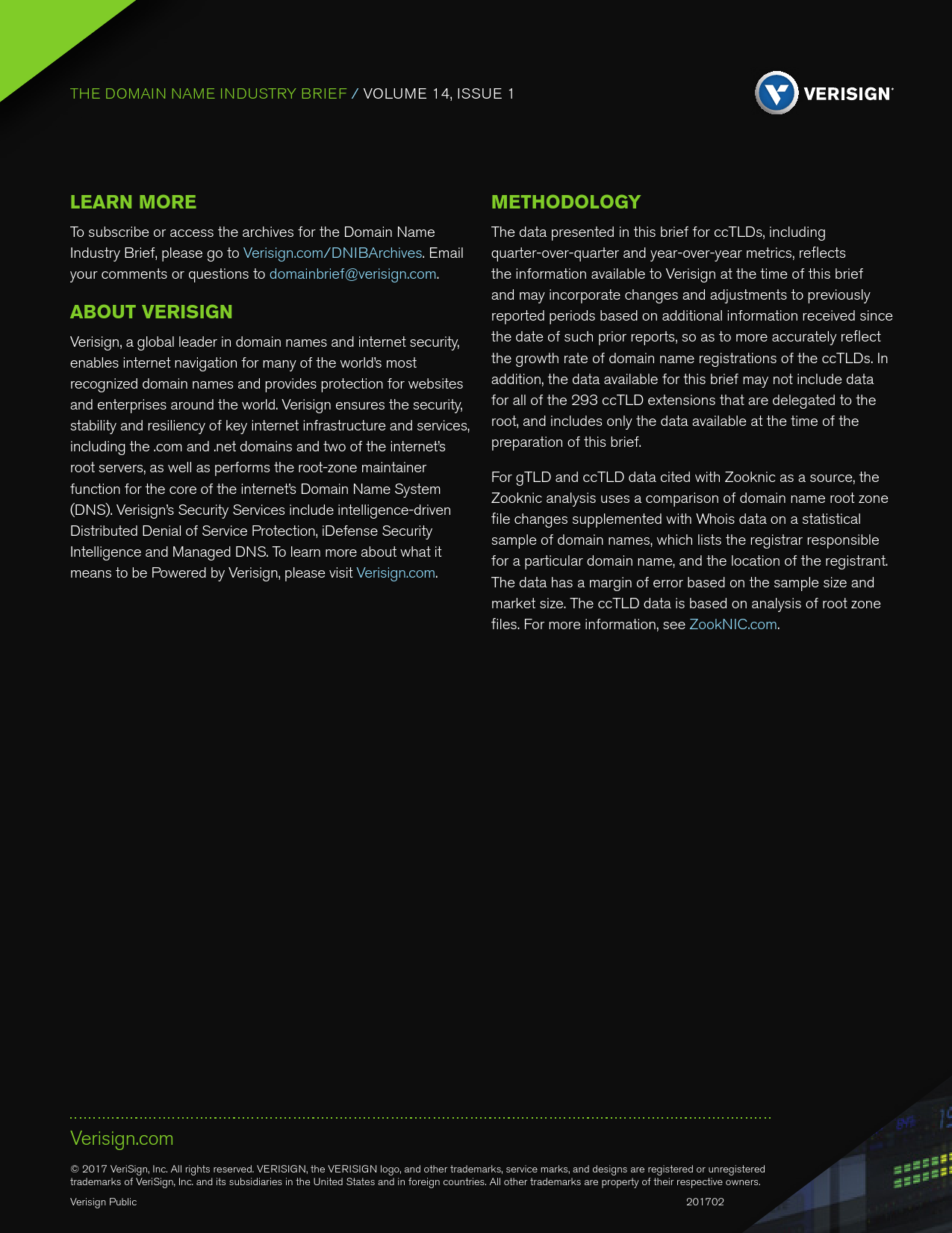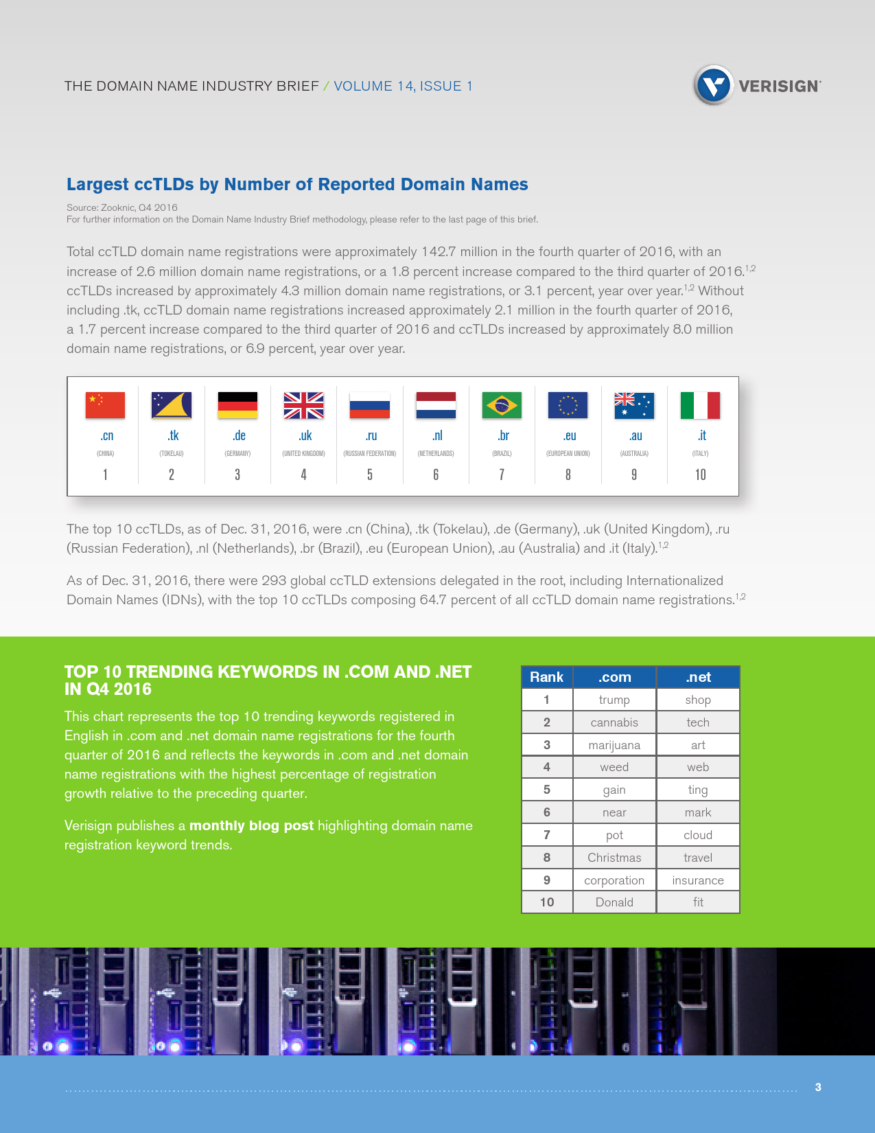 与2016年第三季度1相比,第四季度互联网域名注册量新增230万个,增长1.8%。与2015年第四季度1,2相比,本季度域名注册数量增加了2100万个,同比增长6.8%。