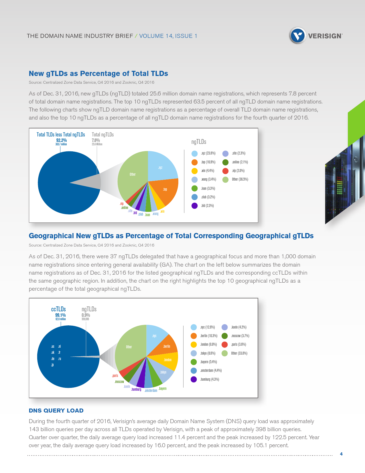 2016年第四季度,在威瑞信运营的所有顶级域名上,威瑞信域名系统(Domain Name System, DNS)日均查询量为1430亿次,最高达到3980亿次。与上季度相比,日均查询量增加了11.4%。峰值上升了122.5%。与去年同期相比,日均查询量增加了16%,最高查询量增加了105.1%。