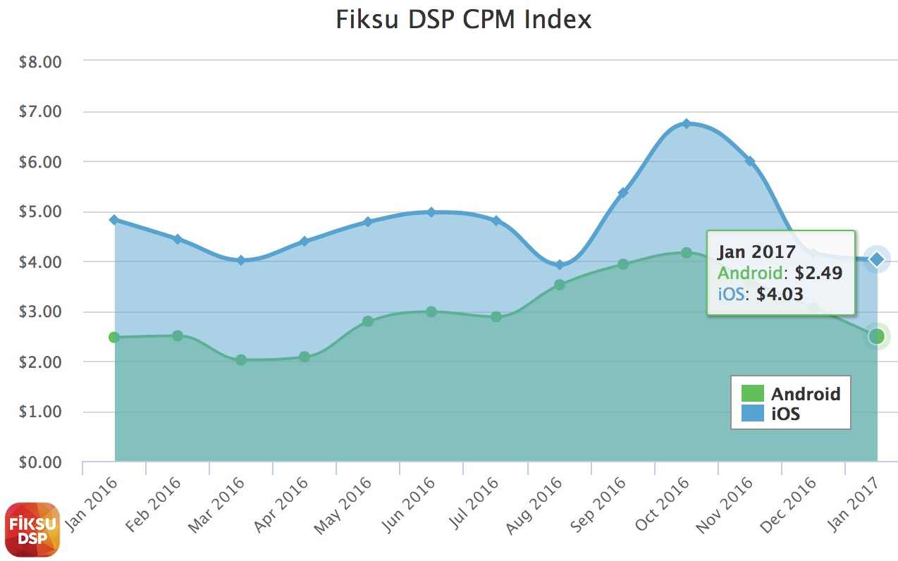 1月期间的应用广告成本,也就是每千次浏览成本(CPM)在iOS和安卓平台都出现了下滑,而且已经是连续三个月下滑,iOS平台1月的CPM是4.03美元,而安卓平台则降到2.49美元。
