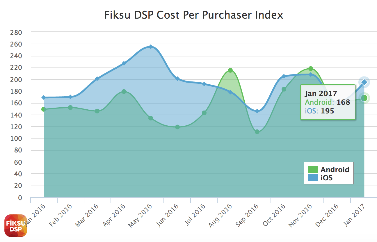 在2016年12月期间,iOS平台每付费用户的获取成本(CPP)降低了23%,1月份则出现了21%的增长,几乎回到了2016年秋季的水平。从同比方面来看,2017年1月获得付费用户的成本比一年之前略高。
