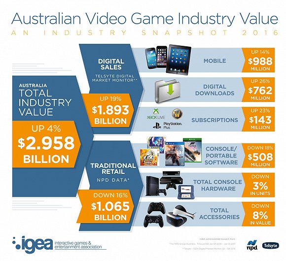 据互动游戏及娱乐委员会(IGEA)称,2016年,澳洲游戏产业创造了29.58亿澳元(约22.64亿美元)的收益,比2015年增长了4%。