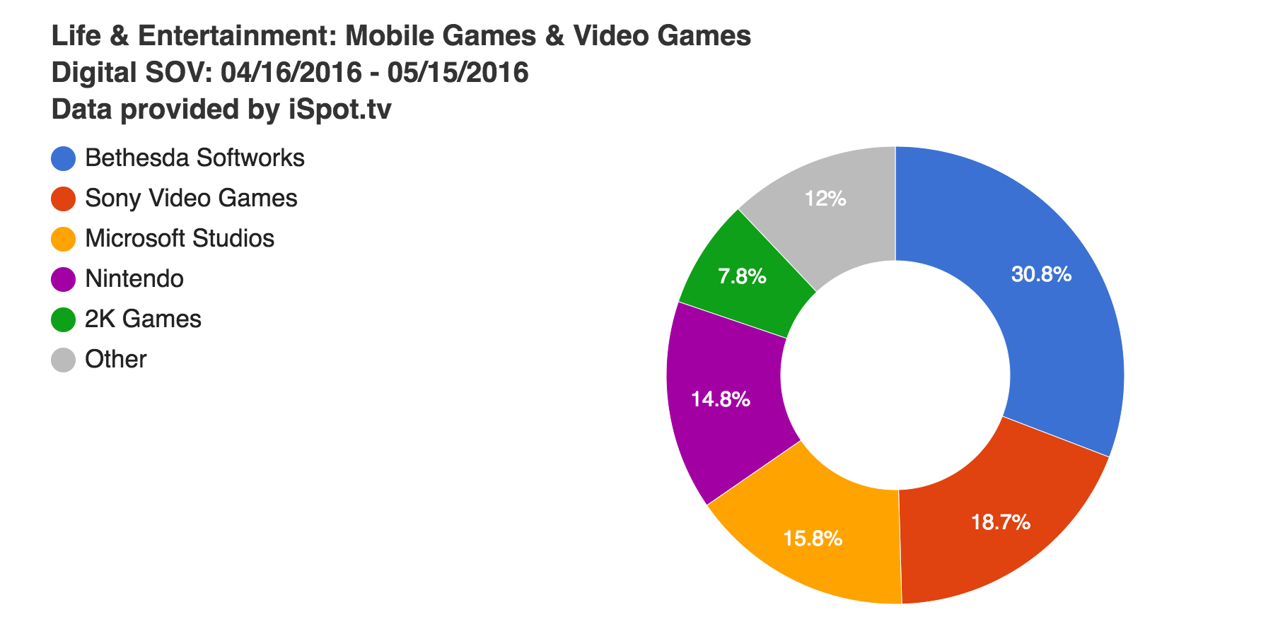 据悉,iSpot.tv的实时广告测量来自1000万台智能电视数据分析,在过去的30天内,任天堂是惟一一家电视广告持续获得大量关注的主机游戏公司,在游戏业电视广告数字观看量方面几乎占据了整个行业数据的一半。总体来说,在此期间27家游戏公司在美国电视台67个点投放超过1.67万次电视广告,预计开支6160万美元(约合人民币4.25亿元),获得电视广告观看量(包括线上)接近19亿次,也正因为如此,超级碗广告的总观看量出现了大幅增长。以下是在1月16日至2月15日的一个月期间游戏业品牌电视广告消费排行榜的前五名: