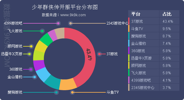 点评:本周《少年群侠传》开服总数较上周略有减少,37游戏下调其开服频率为主要影响因素,新增分布占比平台2345游戏中心。