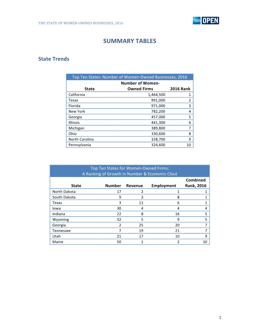 2016年纽约市是女性主导企业营业额最高的(近1400亿美元),其次是洛杉矶(950亿美元)、芝加哥(500亿美元)、底特律(470亿美元)、迈阿密(414亿美元)、亚特兰大(369亿美元)、休斯顿(361亿美元)、底特律(251亿美元)、夏洛特(133亿美元)、奥兰多(123亿美元)、拉斯维加斯(104亿美元)、奥斯汀(103亿美元)和孟菲斯(61亿美元)等。