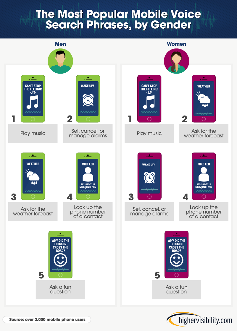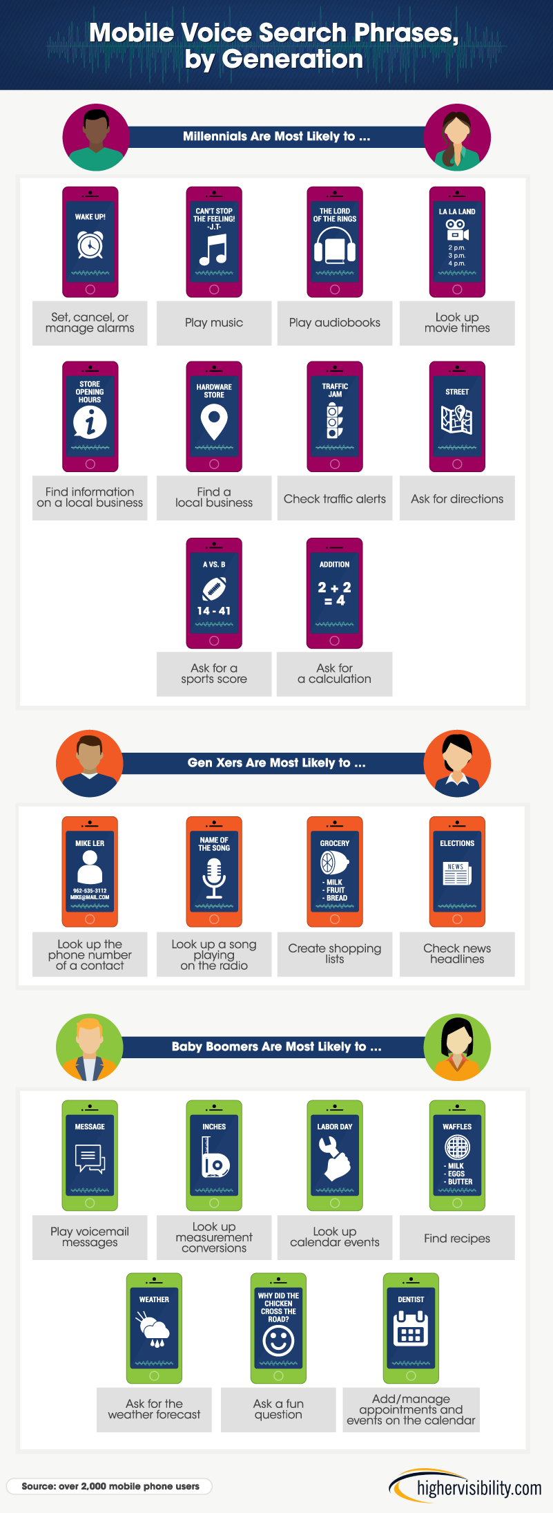 各年龄段的用户使用语音搜索也有些差异。千禧一代更喜欢使用人工智能助手,最喜欢的命令包括设置闹铃、播放音乐和电子书,甚至查询电影上映时间等等。