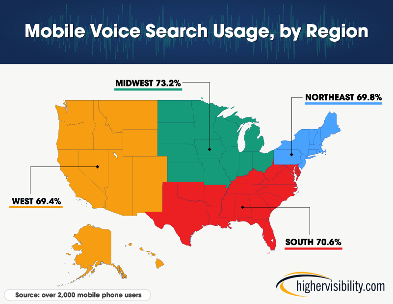 美国各州用户使用语音助手也不尽相同。中西部用户更喜欢使用语音助手,超过73%的受访者至少偶尔使用语音助手。但是,南方人比北方人更不喜欢使用语音助手。尽管加州和华盛顿地区是科技巨头云集之地,只有69%的用户在工作中使用语音助手。