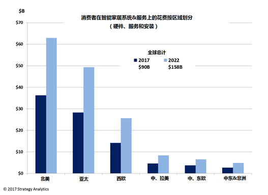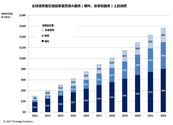 全球消费者在智能家居服务上的支出将从2016年的170亿美元增长近三倍达到2022年的500亿美元。
