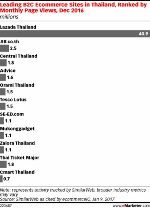 以SimilarWe上泰国电商网站数据为例,Lazada去年12月月页面浏览量近4100万,超过第二名JIB.co.th的16倍。