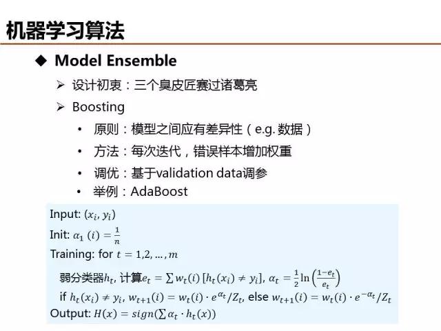 Boosting为Model Ensemble的另外一种方法,其思想为模型每次迭代时通过调整错误样本的损失权重提升对数据样本整体的处理精度,典型算法包括AdaBoost、GBDT等。