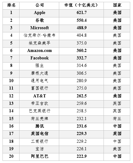 截止2016年底,全球市值最高的十家公司中,有苹果、谷歌、微软、亚马逊和Facebook五家属于数字经济范畴,并且互联网公司囊括了前三位;前20名中有9家属于数字经济,另外四家分别是AT&T、腾讯、英国电信和阿里巴巴。如下表所示。
