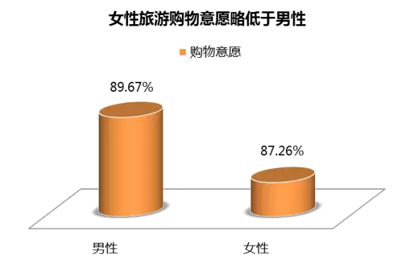 同程旅游《报告》数据显示,46.07%的女性平均一次出游的花费(不含购物)在3000元以上,而男性的这一比例为47.73%。另外,在旅游购物方面,女性在旅途中购物的热情也略低于男性。数据显示,在旅游购物意愿方面,女性的购物意愿为87.26%,而男性的购物意愿则为89.67%(不排除男性为女性购物的情况)。