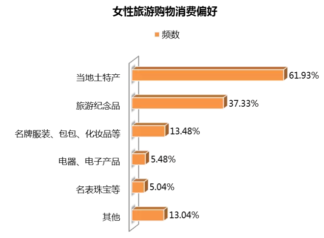 而且,从购物清单上看,女性优先购买的旅游商品也并非人们通常想象中的化妆品和名牌包包。《报告》数据显示,主要用于赠送亲友的土特产和旅游纪念品是她们优先购买的商品,然后才是名牌服装、包包和化妆品等。女性对于名表、珠宝等贵重商品购买比例也不高。