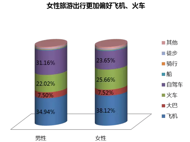在交通工具的选择方面,女性消费者相对更加偏好乘坐飞机、火车(含高铁),飞机是首选。
