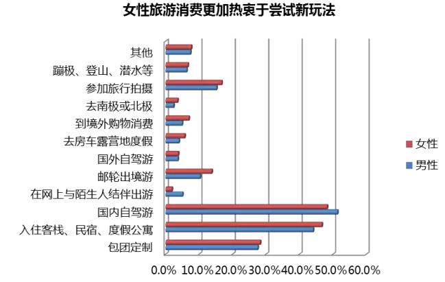 《报告》显示,女性消费者在对待各类新兴旅游玩法的态度上普遍较男性消费者更为积极,她们实际上已成为当前旅游消费升级换代的重要推动力量。从具体数据上来看,除自驾游外,女性在包团定制、邮轮出境游、房车露营度假、极地旅游等方面的尝新热情均高于男性。