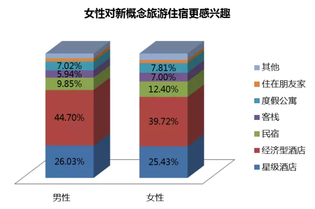 另外,在旅游住宿方面,女性对于民宿、客栈、度假公寓等新概念住宿方式的兴趣也高于男性,依然表现出对新兴旅游消费领域较为浓厚的兴趣。