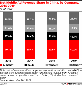 中国移动广告支出快速增长主要受到百度、阿里巴巴和腾讯等科技巨头的推动,这三家企业合起来占2017年中国移动广告支出的72%。