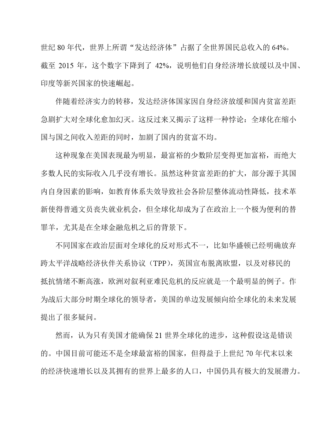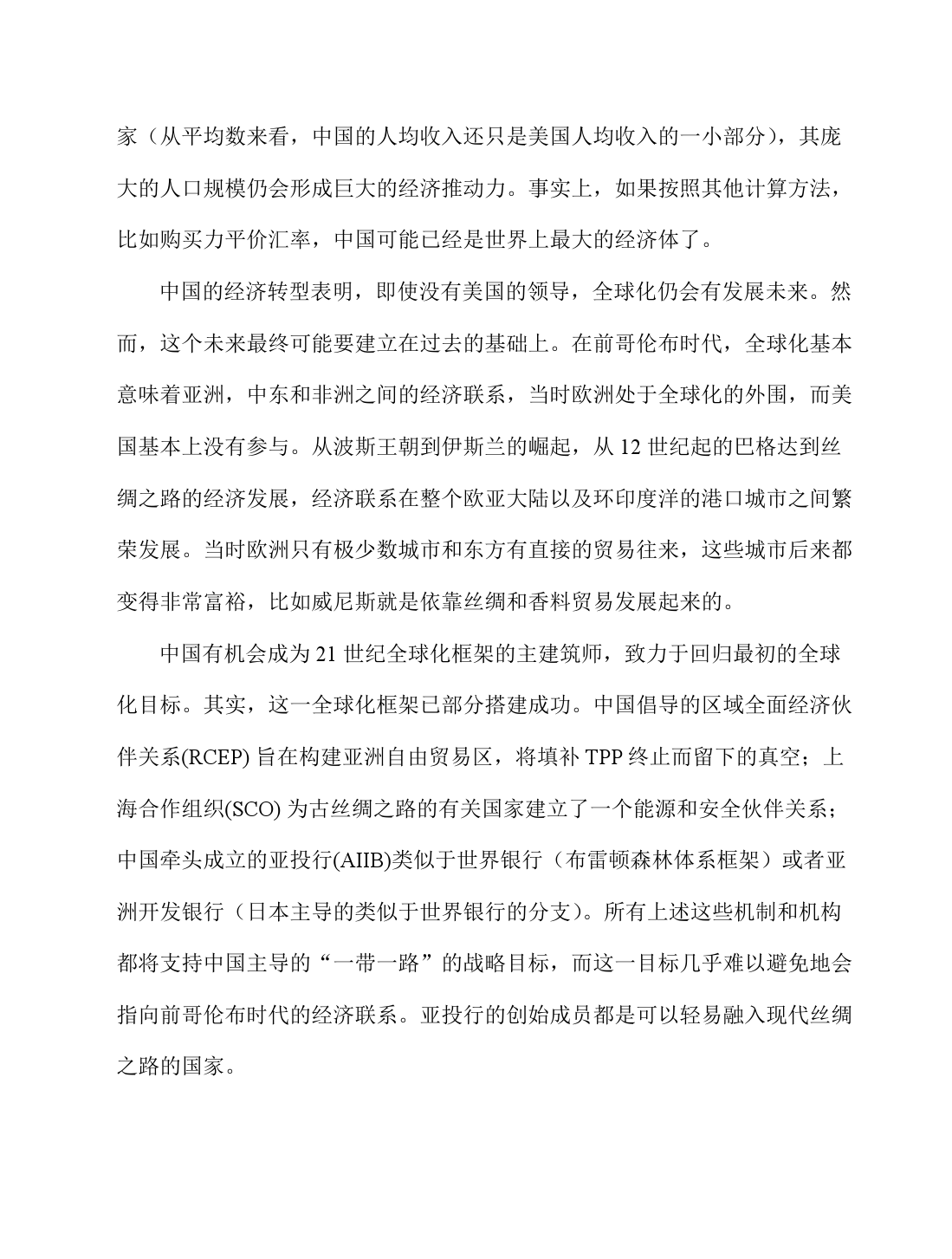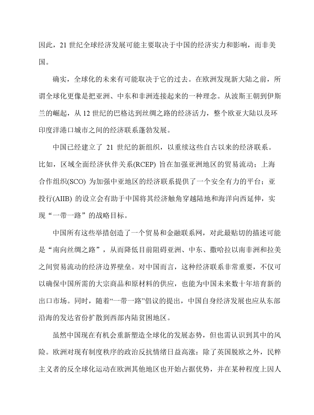 然而,认为只有美国才能确保21世界全球化的进步,这种假设这是错误的。中国目前可能还不是全球最富裕的国家,但得益于上世纪70年代末以来的经济快速增长以及其拥有的世界上最多的人口,中国仍具有极大的发展潜力。因此,21世纪全球经济发展可能主要取决于中国的经济实力和影响,而非美国。