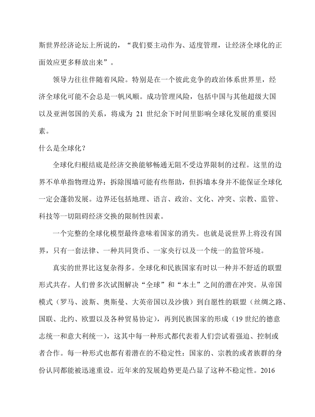 领导力往往伴随着风险。特别是在一个彼此竞争的政治体系世界里,经济全球化可能不会总是一帆风顺。成功管理风险,包括中国与其他超级大国以及亚洲邻国的关系,将成为21世纪余下时间里影响全球化发展的重要因素。