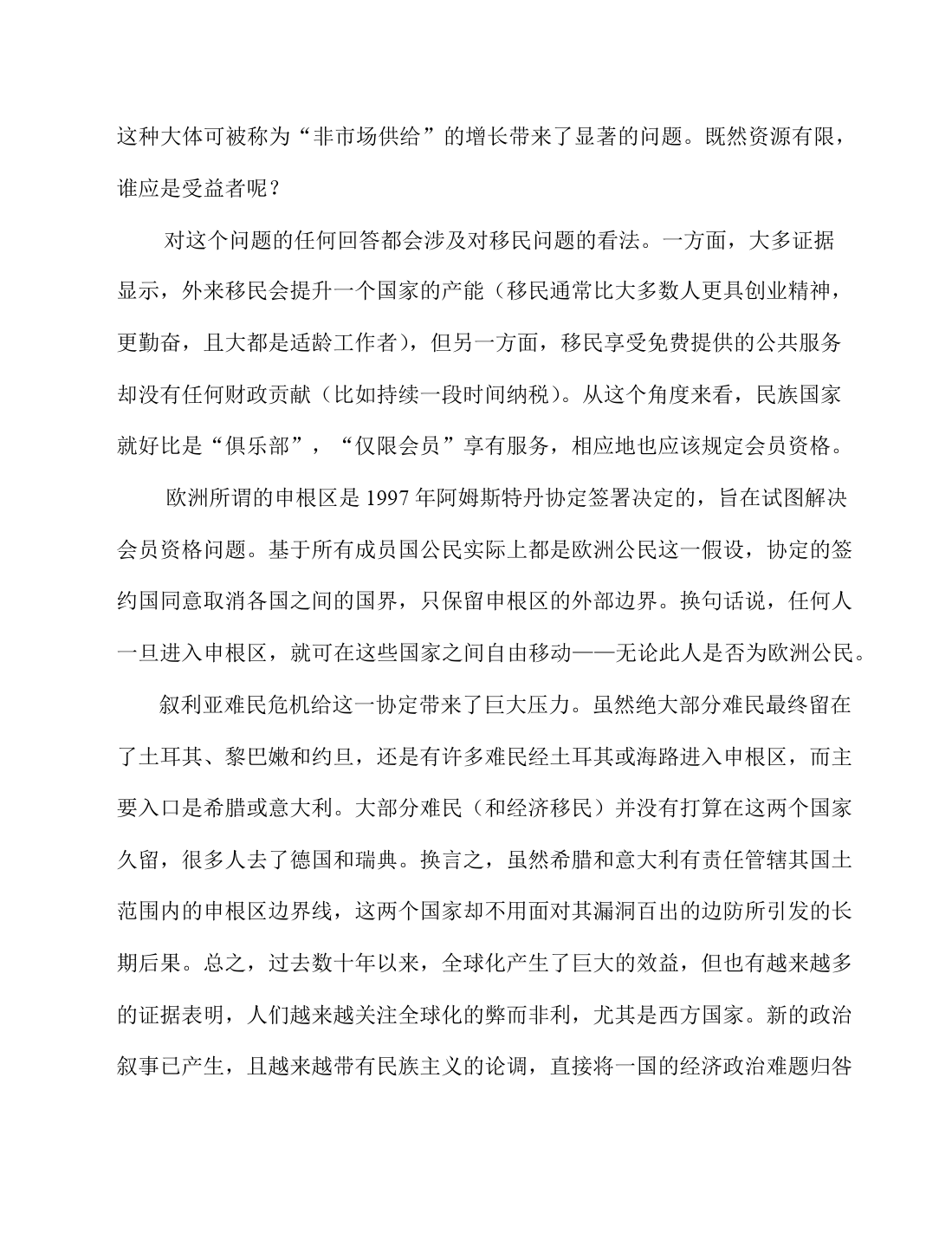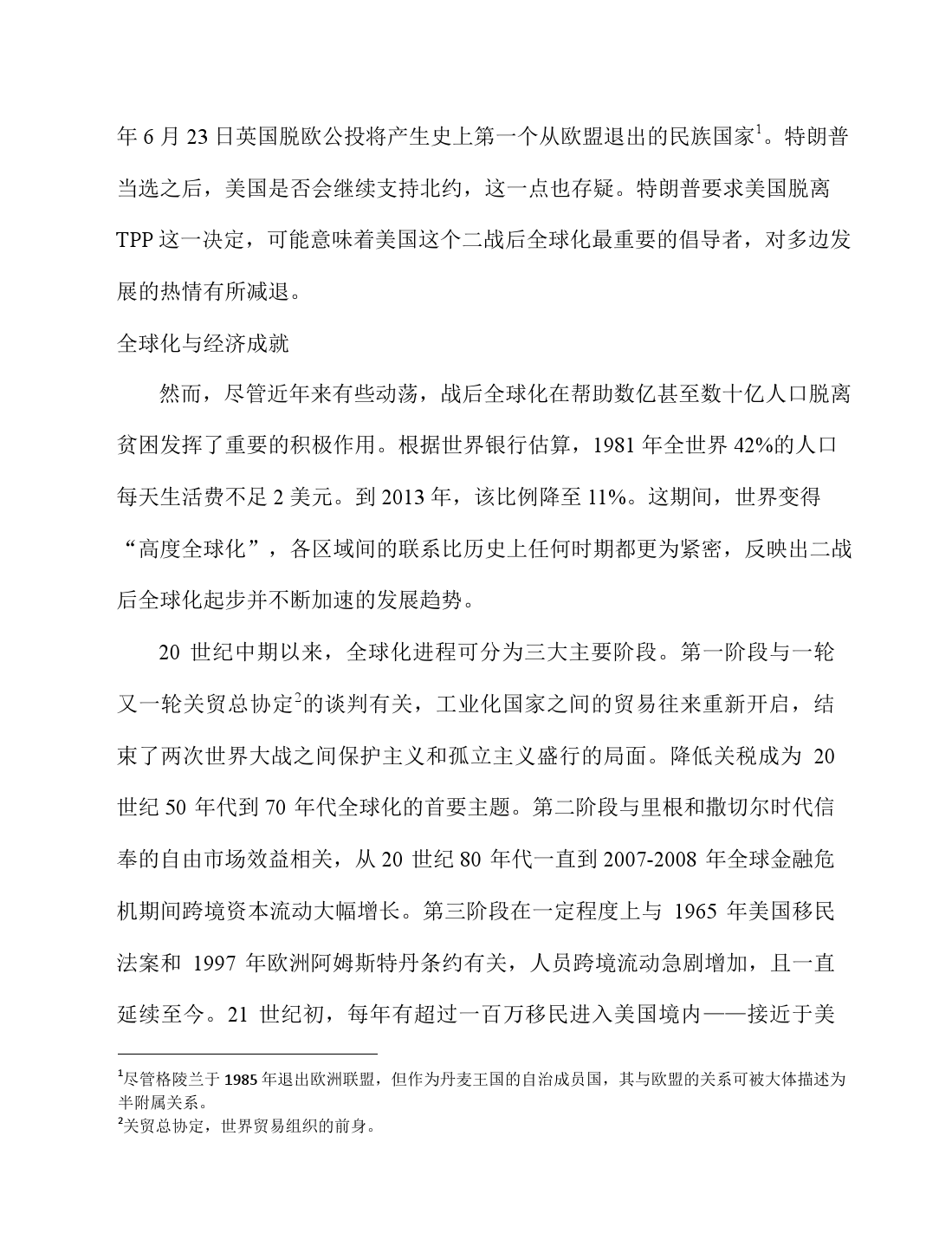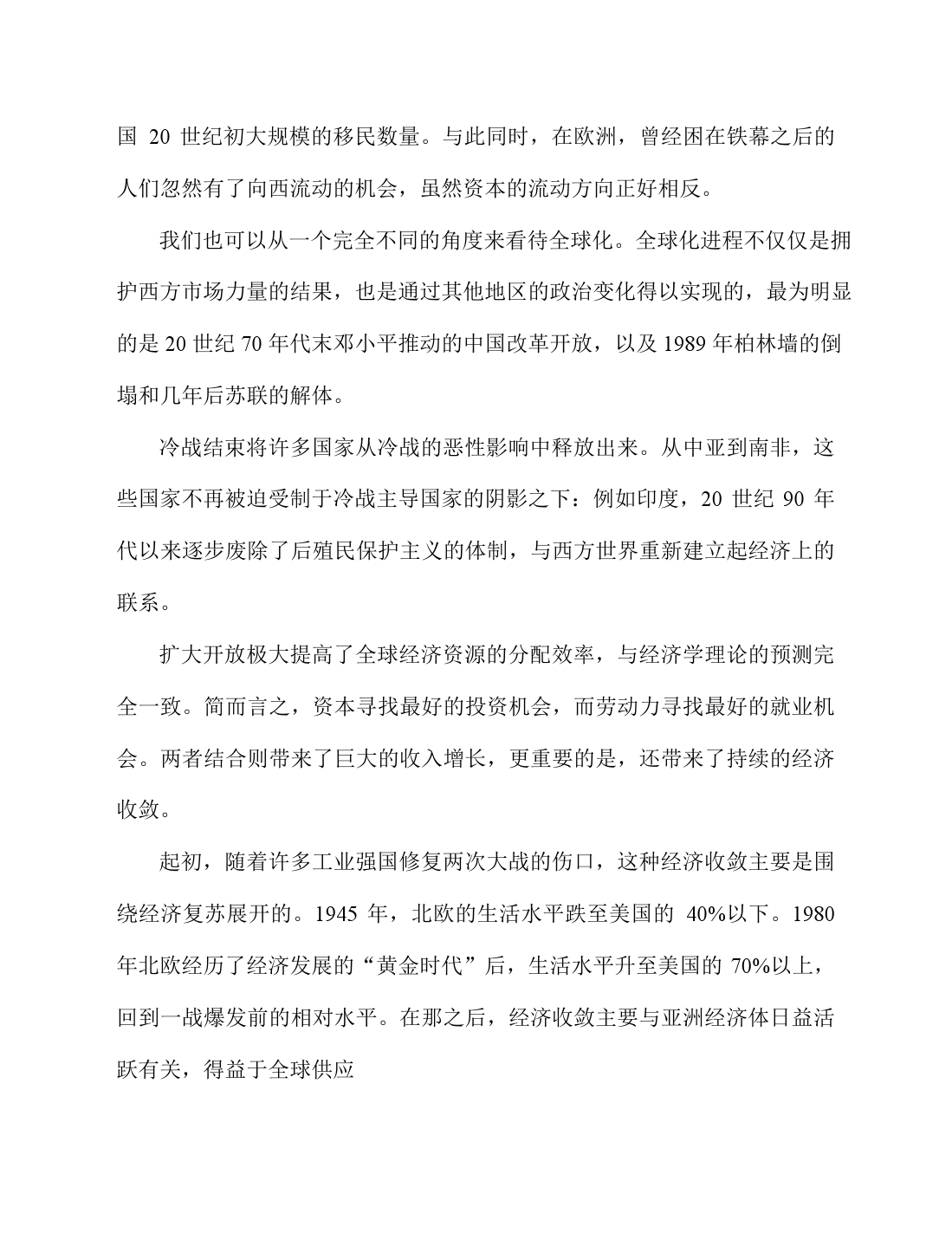 过去数十年里,全球化带来的经济互联性持续提升了我们的生活水准,并大幅度消除了贫困,而今人们对全球化的焦虑也只是在享受了其效益之后才产生的。这种经济互联性通过国际贸易、资本市场和移民而形成,并因为以下三个因素得到强化:(1) 二次世界大战后崛起的国际性经济组织;(2) 邓小平带领下中国的改革开放;以及(3) 以1989年柏林墙倒塌为标志的冷战的结束。