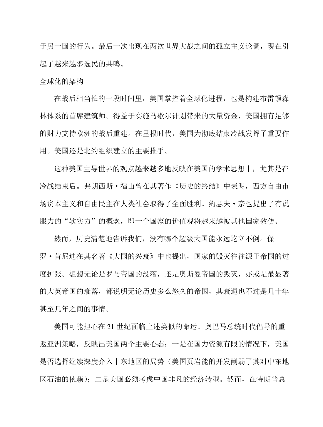 不同国家在政治层面对全球化的反对形式不一,比如华盛顿已经明确放弃跨太平洋战略经济伙伴关系协议(TPP),英国宣布脱离欧盟,以及对移民的抵抗情绪不断高涨,欧洲对叙利亚难民危机的反应就是一个最明显的例子。作为战后大部分时期全球化的领导者,美国的单边发展倾向给全球化的未来发展提出了很多疑问。