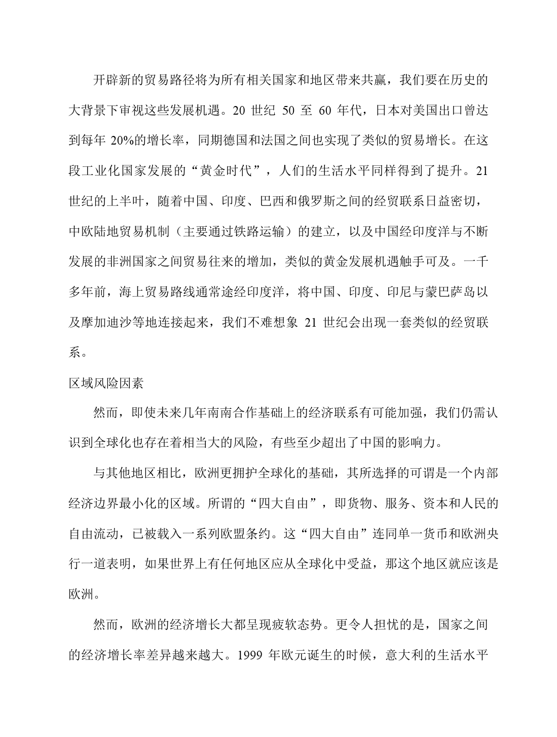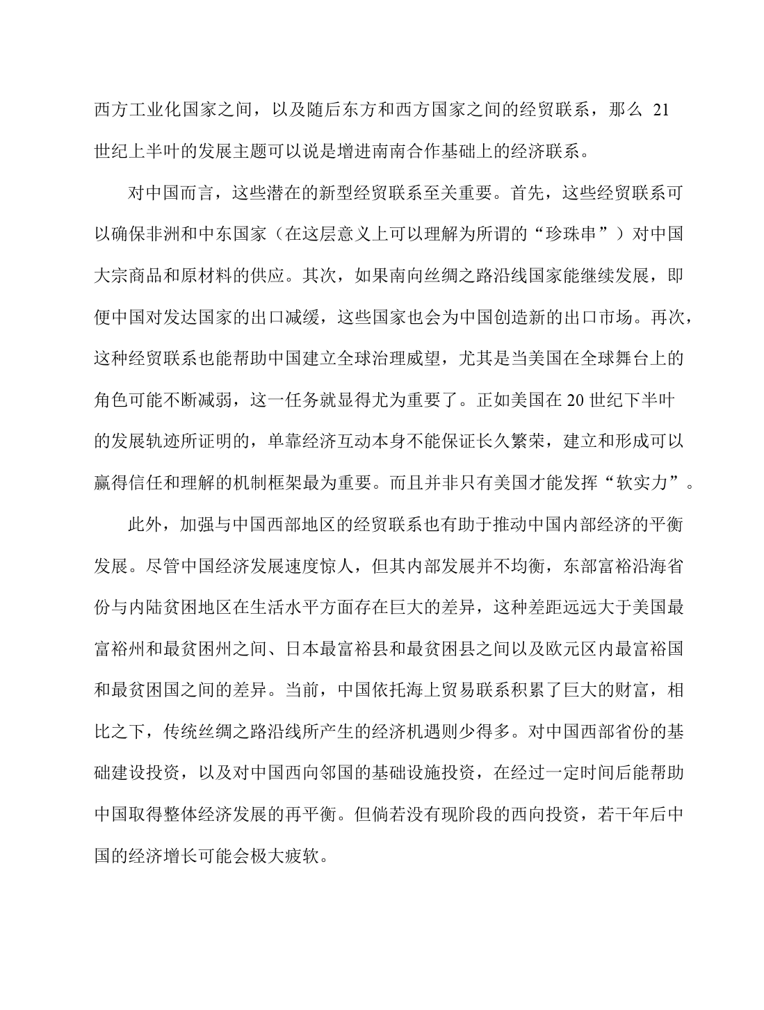 中国所有这些举措创造了一个贸易和金融联系网,对此最贴切的描述可能是“南向丝绸之路”,从而降低目前阻碍亚洲、中东、撒哈拉以南非洲和拉美之间贸易流动的经济边界壁垒。对中国而言,这种经济联系非常重要,不仅可以确保中国所需的大宗商品和原材料的供应,也能为中国未来数十年培育新的出口市场。同时,随着“一带一路”倡议的提出,中国自身经济发展也应从东部沿海的发达省份扩散到西部内陆贫困地区。