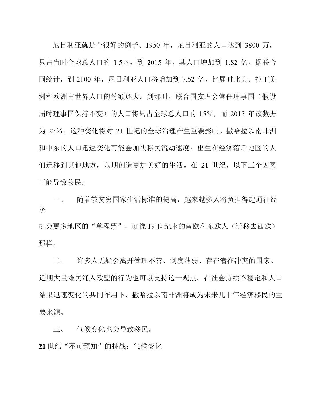 第二,随着大部分发达国家,甚至中国以及亚洲许多其他国家人口不断老龄化,撒哈拉以南非洲正步入婴儿潮,这将极大地改变21世纪的人口结构。那些全球化组织,从联合国安理会到其下设机构,都必须要制定出应对人口结构变化及其可能带来的移民潮。