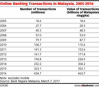 马来西亚国家银行统计了移动设备上的银行交易额,2016年增长60%,到达62.9亿美元。